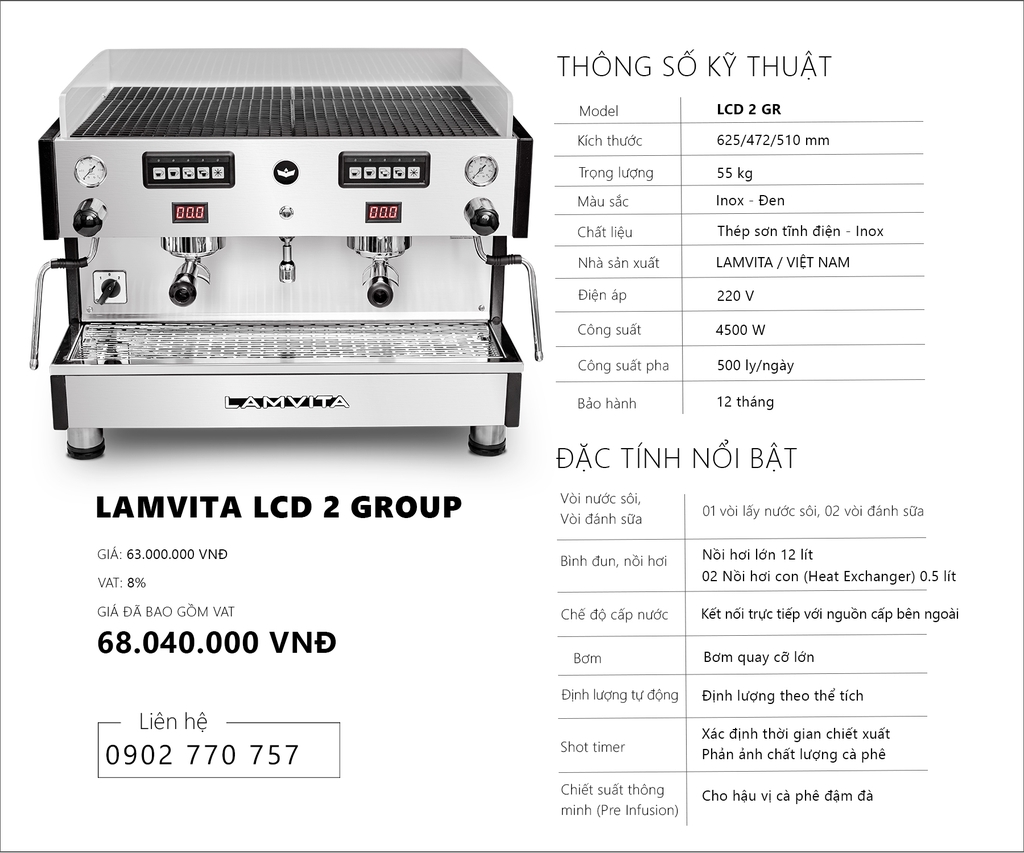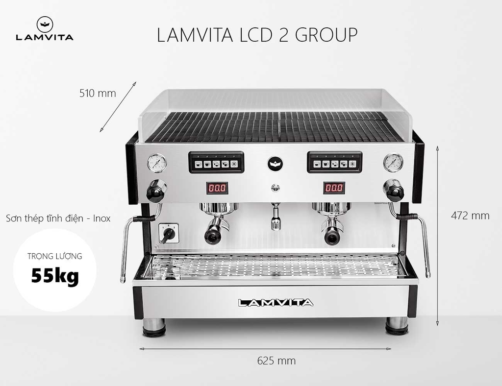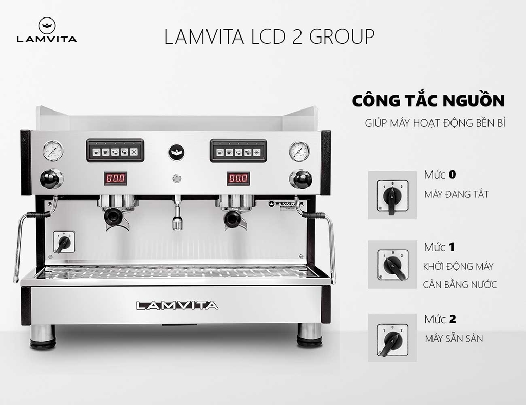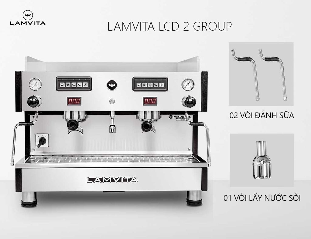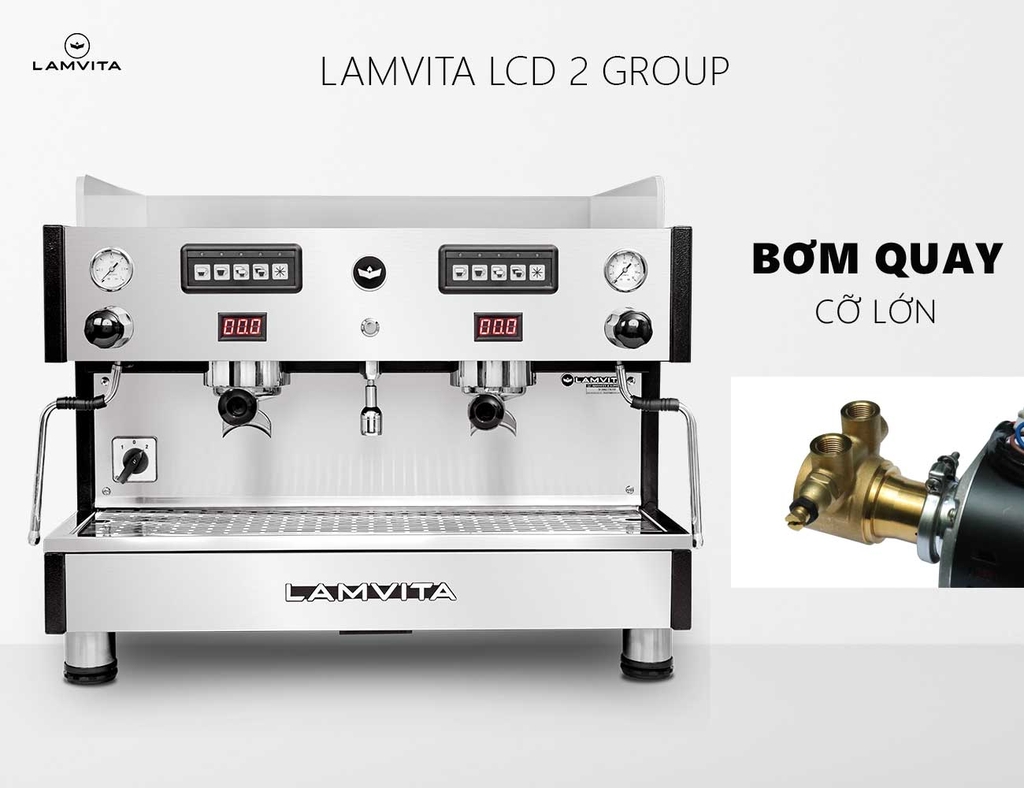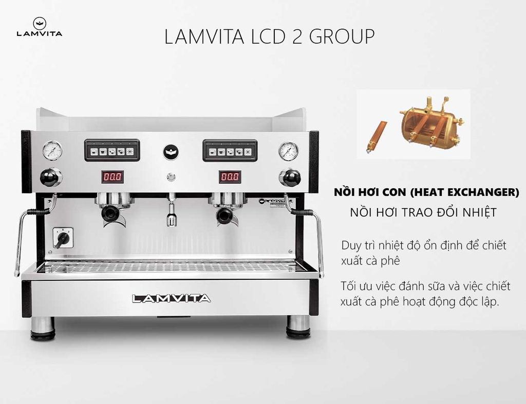 LAMVITA LCD 2 Group là dòng máy pha chuyên nghiệp, được trang bị nồi hơi (Boiler) lớn 12 lít cho áp suất hơi mạnh tạo bọt sữa mịn màng và khô. Bên trong nồi hơi lớn có bộ đun nước sôi (Heater) dài bằng nồi hơi giúp gia nhiệt nhanh tức thì và có thêm 2 nồi hơi con (Heat Exchanger) phục vụ việc pha cà phê.